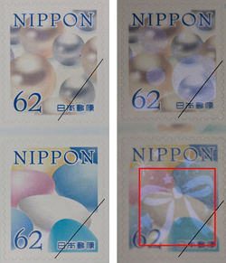 傾けると、真珠のような光沢が見えるパールインキは、お札の偽造防止のために用いられている技術ですが、普通切手や、特殊切手(記念切手など)にも使われています。
