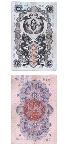 この10円券の表面は、黒色で凹版印刷された主模様と、青色で凸版印刷された地紋が組み合わされています。凹版による細密な絵柄と、凸版による色鮮やかな地紋の重ね刷りは、ヨーロッパで発達した近代的なお札の印刷方式です。様式は縦長で、絵柄には鳳凰と竜、菊花紋章などが描かれており、和洋折衷の外観が日本のお札の近代化の過程を示しています。